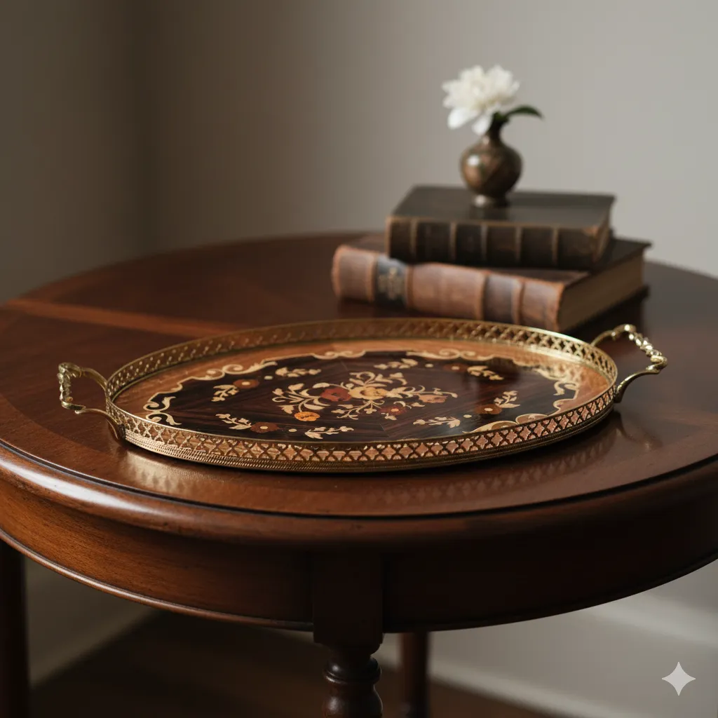 این سینی معرقکاری ، شاهکاری از هنر دست است که در آن، تقابل چوبهای تیره و روشن، یک اثر هنری پویا خلق کرده است. زمینه تیره و صیقلی سینی، از چوب گردو ساخته شده که مانند یک بوم آماده، طرحهای مواج چوبهای روشنتر را در آغوش گرفته است. در مرکز این سینی، نقشی از گلهای ظریف با چوبهای افرا و زیتون، جلوهای دلنشین و سرزنده ایجاد کرده است. حاشیه آلومینیومی با روکش طلایی و دستههای کلاسیک، قاب این اثر هنری را تکمیل میکنند. این محصول نه تنها یک سینی پذیرایی، بلکه یک تابلوی هنری کاربردی است که به هر فضایی اصالت میبخشد.