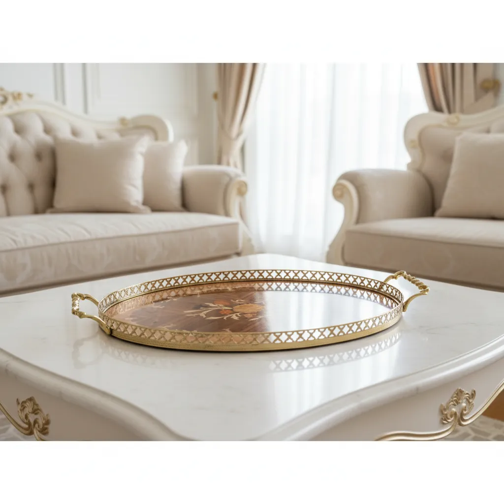 این سینی معرقکاری، یک اثر هنری دلنشین است که با فرم بیضی و ترکیب رنگی جذاب خود، جلوهای متفاوت و گرم دارد. زمینه سینی از چوبهایی با طیف رنگی روشن مانند افرا و کاج ساخته شده که با نقوش منظم و چشمنواز، زیبایی طبیعی چوب را به نمایش میگذارد. در بخش مرکزی، یک قاب تیره از چوب گردو به همراه نقوشی ظریف، طرح مرکزی گلدار را قاب گرفته است. حاشیه آلومینیومی با پرداخت ویژه و دستههای کلاسیک، زیبایی و دوام این سینی را تکمیل میکنند. این محصول، نمادی از سلیقه و اصالت است که به هر فضایی روح میبخشد.