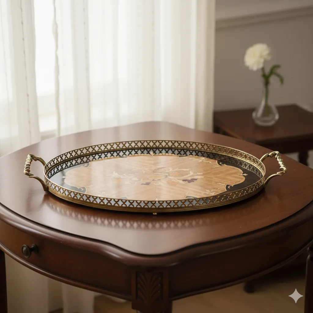 این سینی معرقکاری، یک اثر هنری فاخر و متمایز است که با کنتراست رنگی قدرتمند، جلوهای چشمنواز خلق کرده است. قاب بیضیشکل سینی از چوب گردوی بسیار تیره و صیقلی ساخته شده که عمق و شکوهی خاص به آن بخشیده است. در مرکز این اثر، معرقکاری با چوبهای روشن و باکیفیت مانند افرا و بید، فضایی درخشان و برجسته ایجاد کرده که در آن، نقش یک گل زیبا به دقت هرچه تمامتر کار شده است. حاشیه آلومینیومی با پرداخت دقیق و دستههای خوشساخت، این سینی را به یک کالای لوکس و باارزش تبدیل کردهاند. این محصول، انتخابی ایدهآل برای کسانی است که به دنبال یک شیء کاربردی با جلوه هنری چشمگیر هستند.