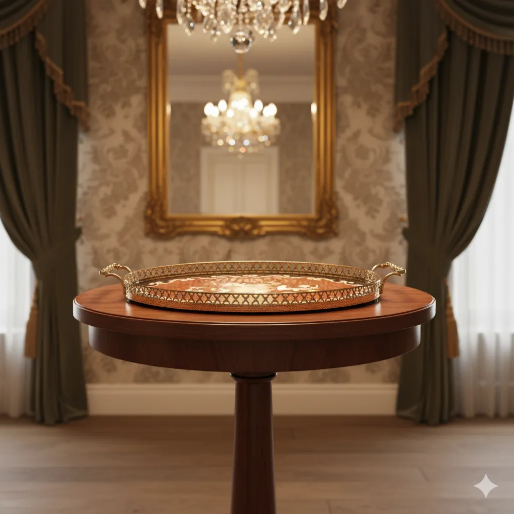 این سینی معرقکاری، یک نمونه عالی از هنر دستی است که با نهایت دقت و ظرافت خلق شده است. پسزمینه آن از چوب گردوی تیره ساخته شده که با رگههای طبیعی خود، عمق و جذابیت بصری ویژهای به آن بخشیده است. در بخش میانی، چوبهای روشن و باکیفیت مانند افرا و زیتون با رگههای مواج خود، پسزمینهای دلنشین برای نقش گلهای معرقکاری فراهم کردهاند. جزئیات ظریف گلها، مهارت استادکار را نشان میدهد. حاشیه و دستههای آلومینیومی با پرداخت دقیق، استقامت و جلوه این سینی را تکمیل میکنند.