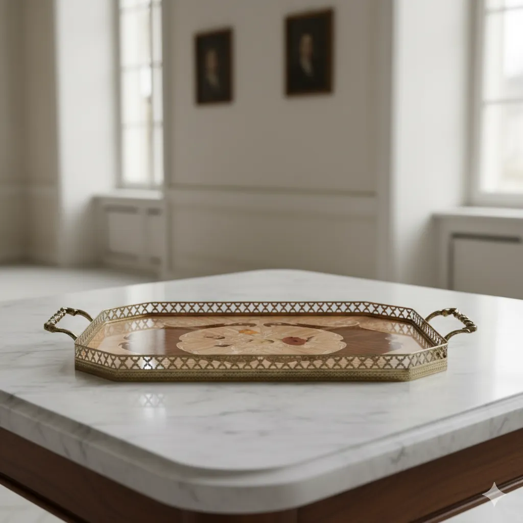 این سینی معرقکاری، محصولی بینظیر و خلاقانه است که با ترکیب بافتهای متنوع چوبی، چشماندازی منحصربهفرد را به نمایش میگذارد. پسزمینه آن از چوب افرا با رگههای مواج و طبیعی ساخته شده که حسی از پویایی و لطافت را منتقل میکند. در مرکز، قابی هشتضلعی از چوب گردوی تیرهتر، طرح اصلی گلدار را در بر گرفته است. این نقوش، با ظرافت و دقت فراوان، همچون یک نگارگری طبیعی در قلب سینی میدرخشند. حاشیه و دستههای فلزی با طرح زنجیرهای، جلوهای از صلابت و اصالت را به این شاهکار اضافه میکنند. این سینی، انتخابی برای افرادی با سلیقهای متمایز و نگاهی هنرمندانه به زندگی است.