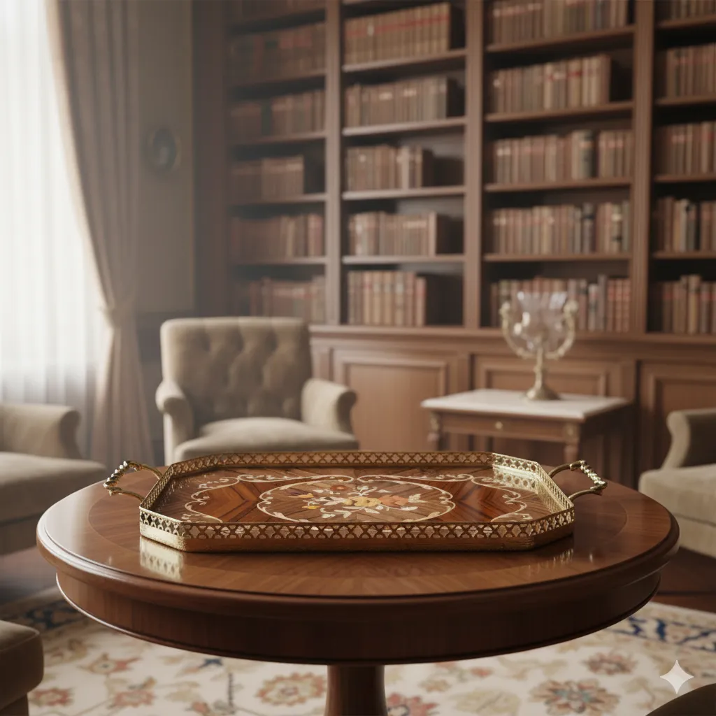 این سینی معرقکاری، محصولی فاخر و تجملی است که با ترکیب رنگی چشمنواز و طراحی کلاسیک، جلوهای از شکوه را به نمایش میگذارد. پسزمینه آن از چوب گردوی تیره و صیقلی ساخته شده که با خطوط هندسی منظم و بافت طبیعی خود، عمق و جذابیت خاصی به کار بخشیده است. در بخش میانی، نقشی از گلها و برگهای ظریف با استفاده از چوبهای روشن و رنگی قرار گرفته که همچون نگینی درخشان در قلب این اثر میدرخشد. حاشیه و دستههای فلزی با طرح پیچیده، زیبایی و دوام این سینی را دوچندان کردهاند. این محصول، نمادی از سلیقه و اصالت است که به عنوان یک کالای ارزشمند، میتواند زینتبخش هر خانهای باشد.